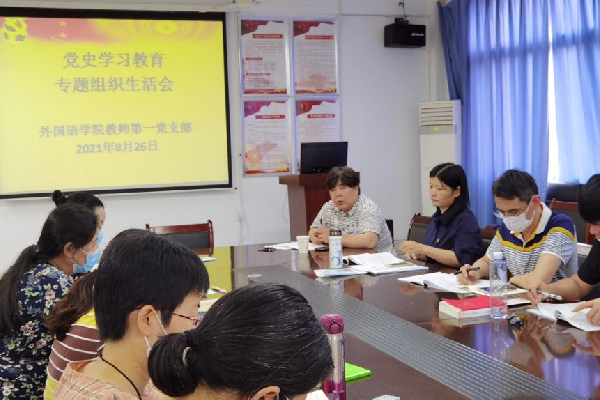 本网讯(通讯员 黄锦)8月26日,外国语学院教师第一党支部在学院会议室召开党史学习教育专题组织生活会。校党委书记张国秀以一名普通党员的身份参加了此次组织生活会,并与党员同志们进行了深入地交流。
