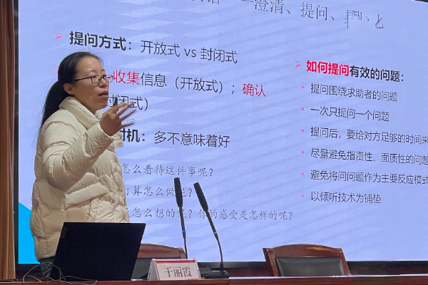 本网讯(通讯员 郑婧)为提升辅导员专业素养与工作技能,12月4日,学生工作部(处)在行政楼五号会议室面向全体辅导员举办了“学思讲堂”第九期辅导员专题培训。培训邀请了华中师范大学心理健康教育中心副主任、副教授于丽霞,以“辅导员谈心谈话技巧”为题进行讲授,学生工作部副部长刘兴主持培训会。