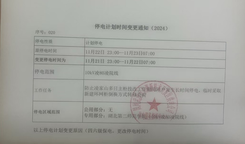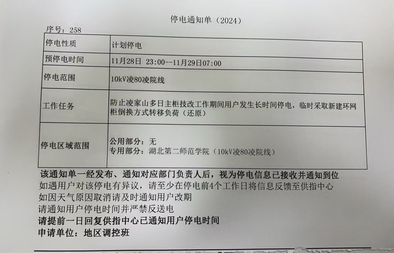 根据国家电网武汉市东湖新技术开发区供电公司的停电通知,凌家山变电站进行主柜技改工作,为防止技改工作期间用户发生长时间停电,确保2024年下半年全国大学英语四、六级口语考试顺利进行,经与供电公司协商,原定于11月22日23:00至11月23日07:00的停电时间变更为2024年11月21日(星期四)23:00至11月22日(星期五)7:00,对我校一回10kv凌80凌院线临时采取新建环网柜倒换方式转移负荷。同时2024年11月28日(星期四)23:00至11月29日(星期五)7:00,停电对凌院线临时采取新建环网柜倒换方式转移负荷进行还原。届时停电范围如下: